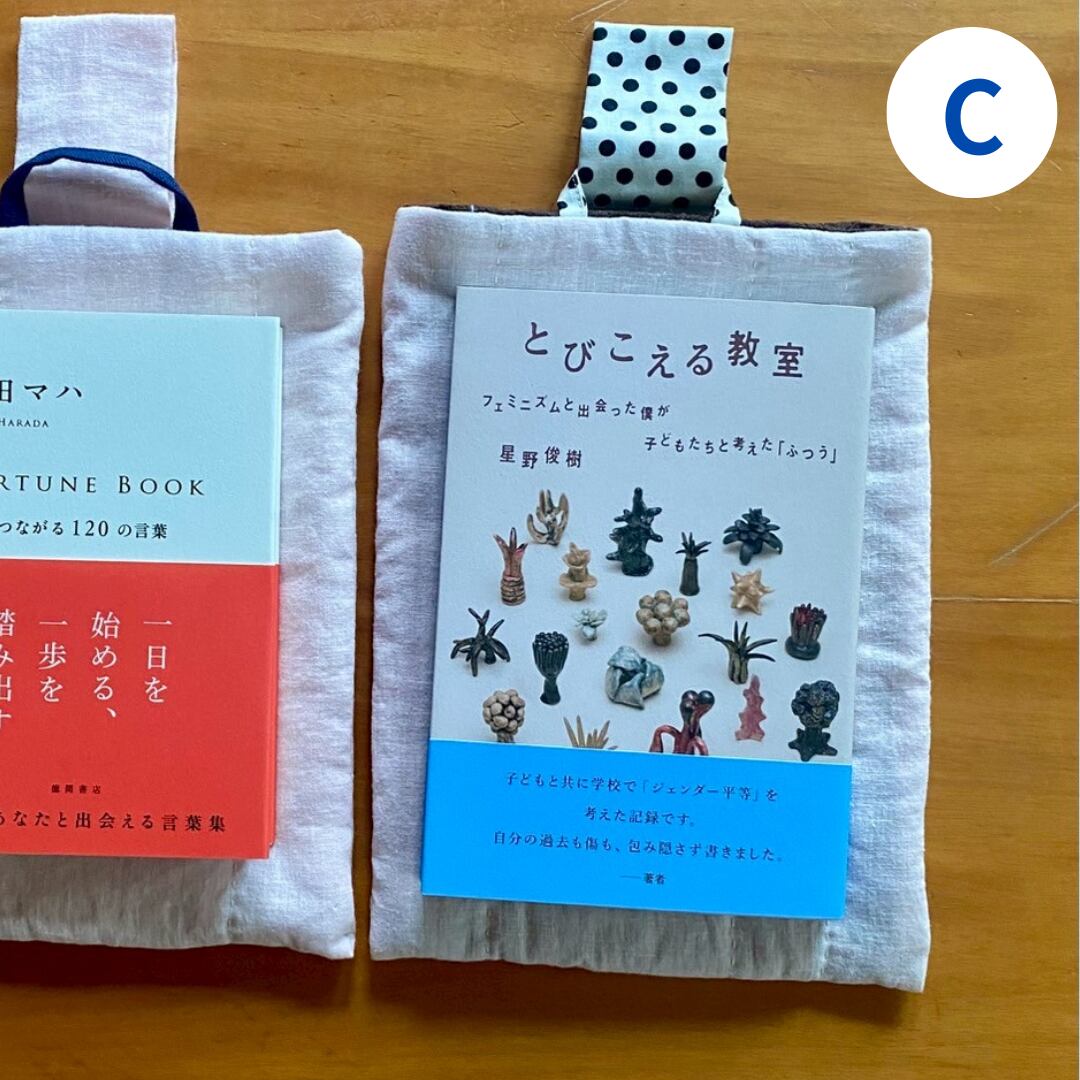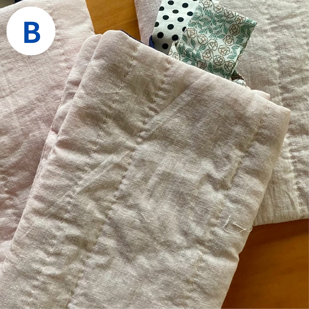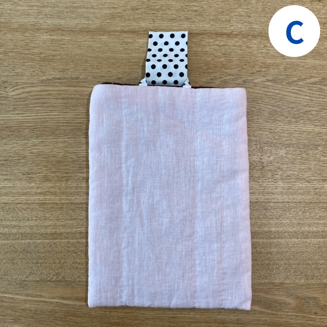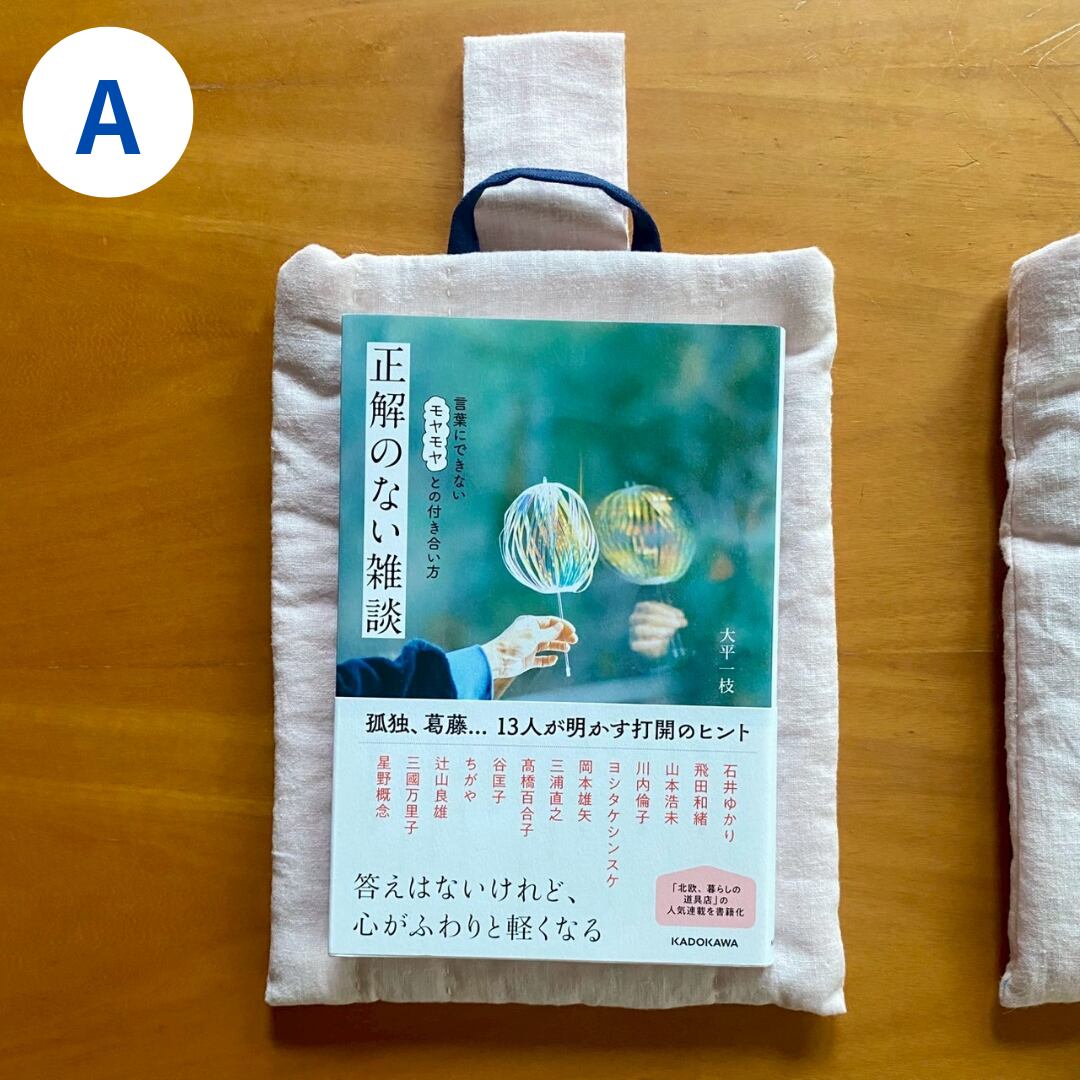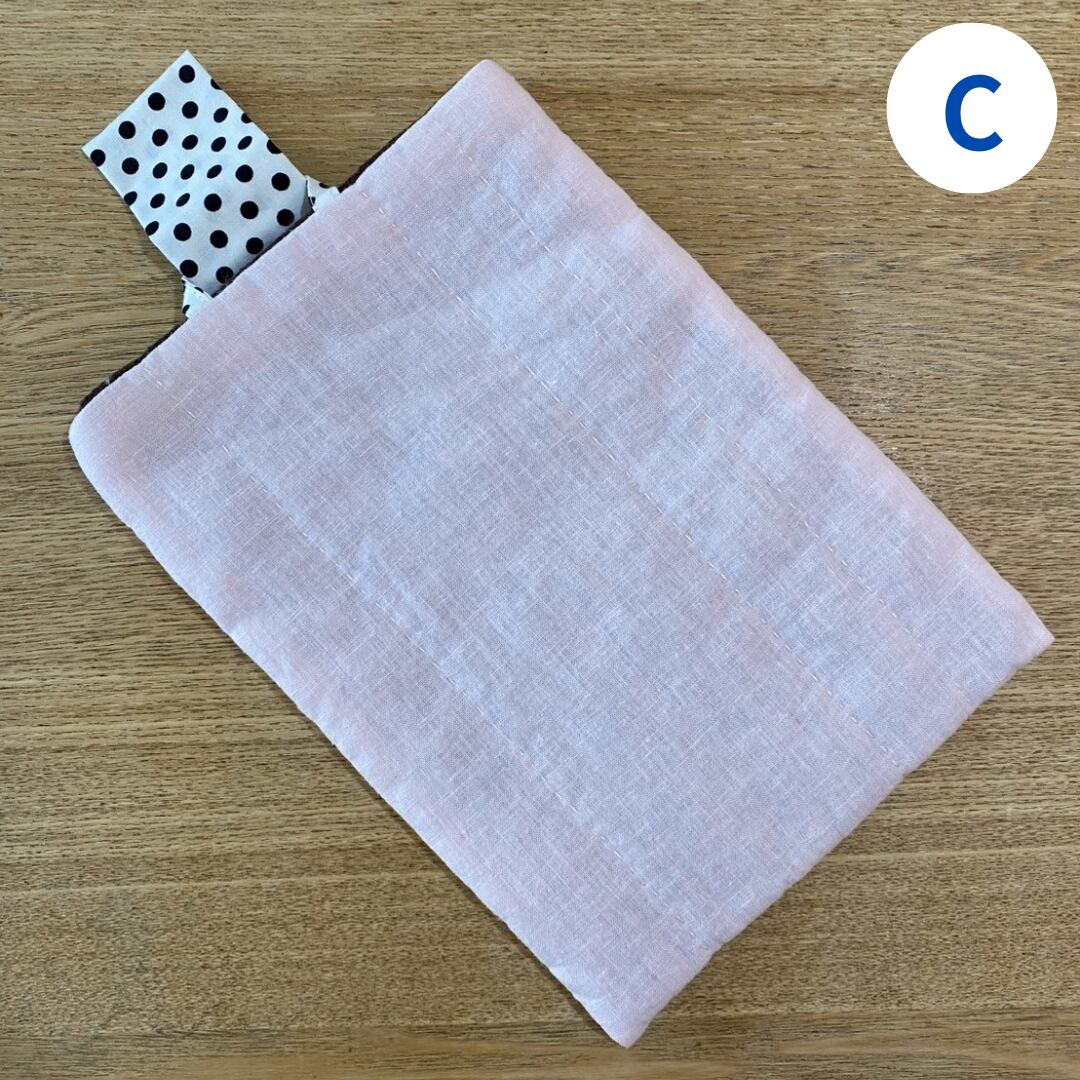 薄いリネンの生地、キルト芯、裏地の重なりで、本をしっかり包んでくれ、持ち運ぶのに安心です。