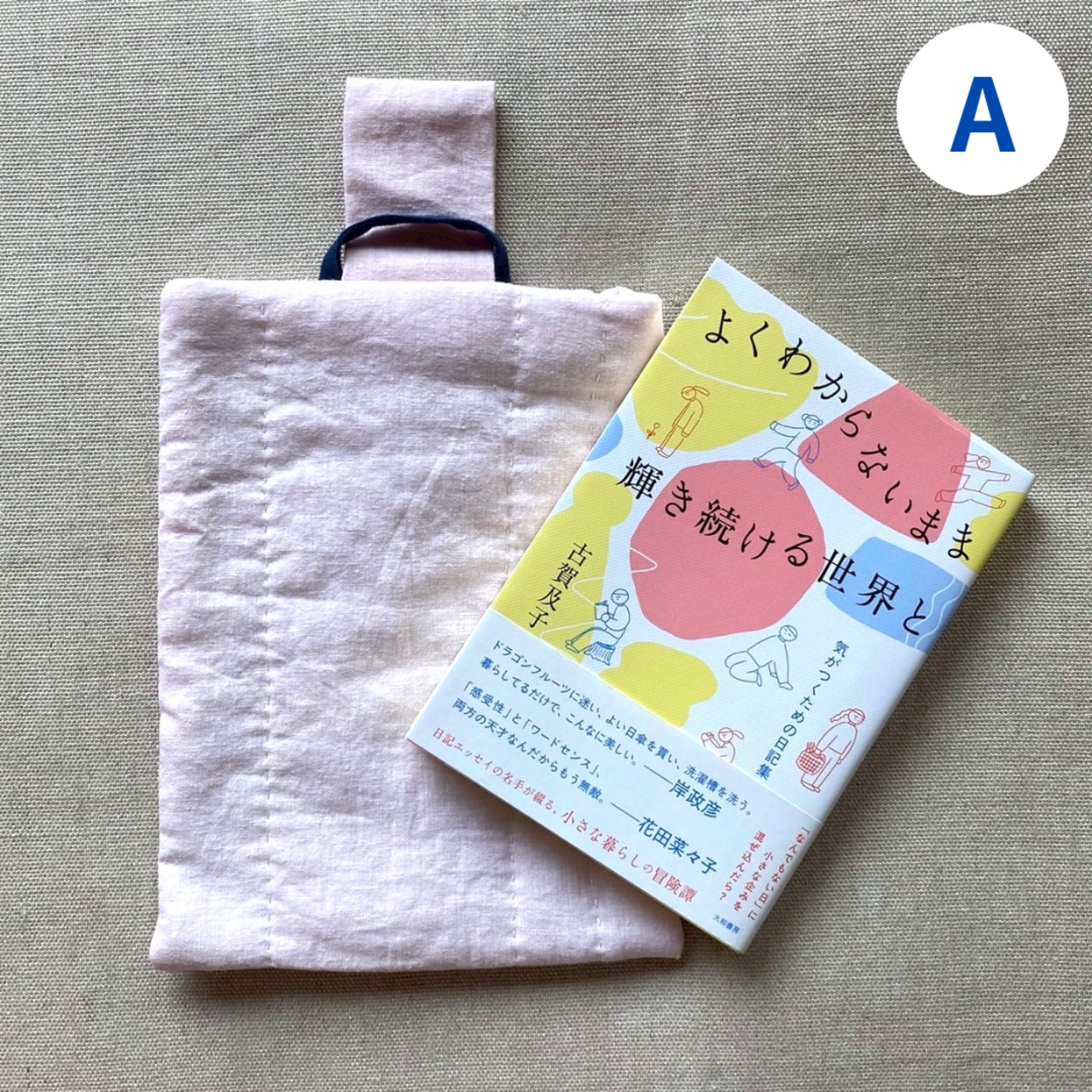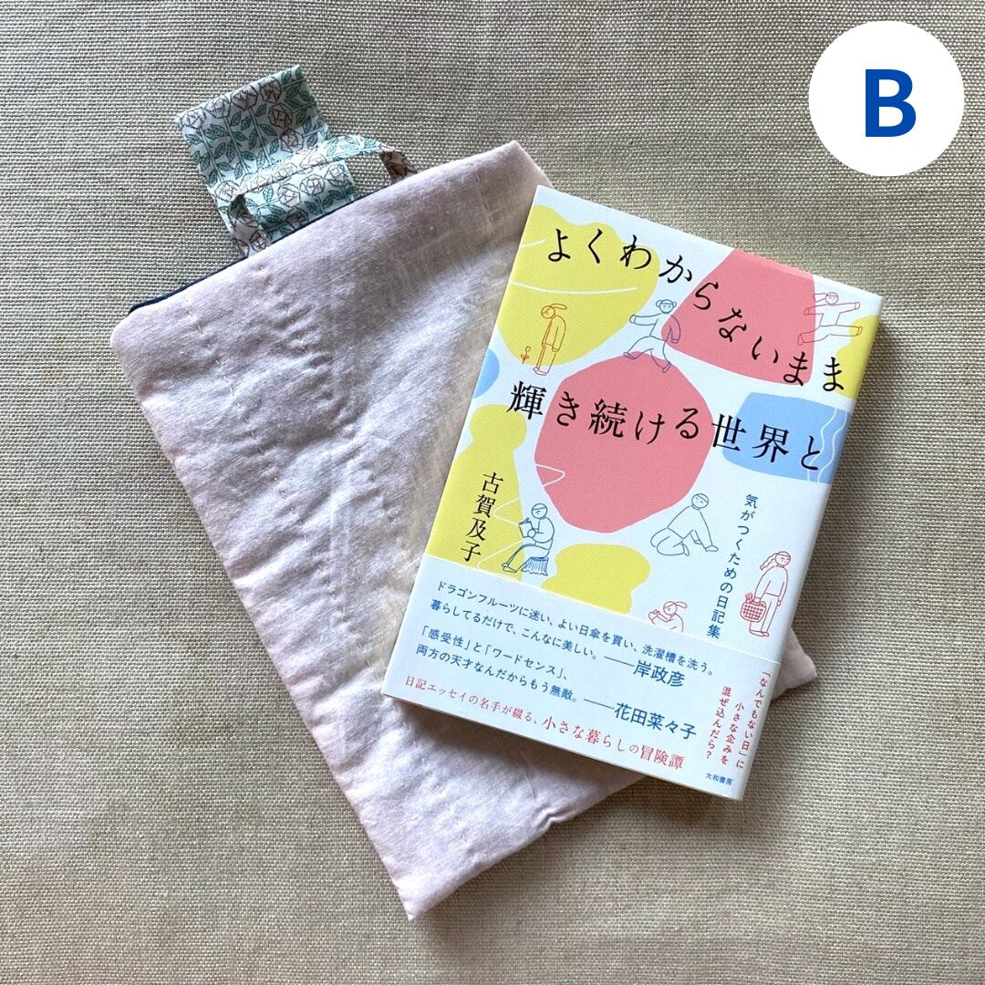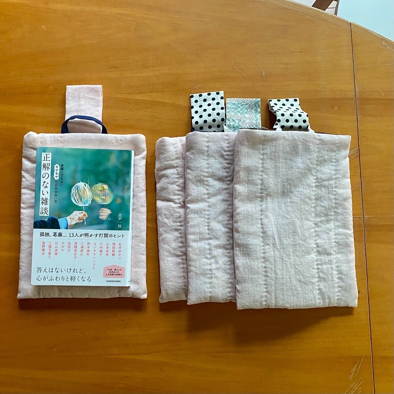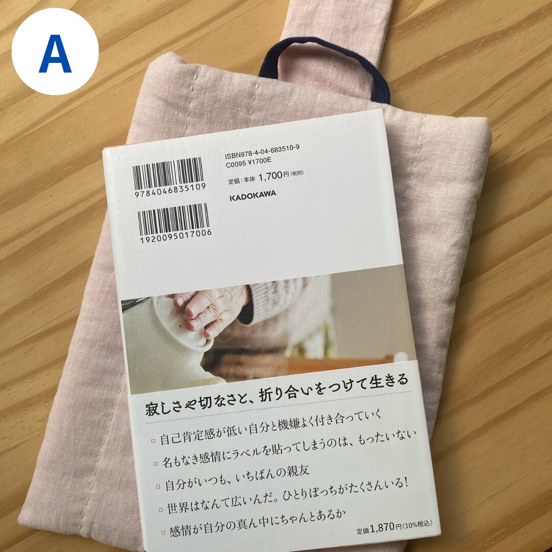 薄いリネンの生地、キルト芯、裏地の重なりで、本をしっかり包んでくれ、持ち運ぶのに安心です。