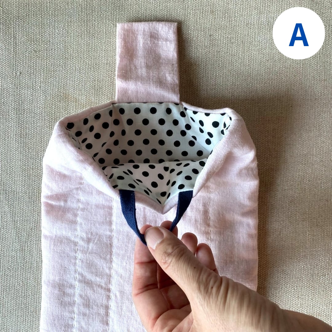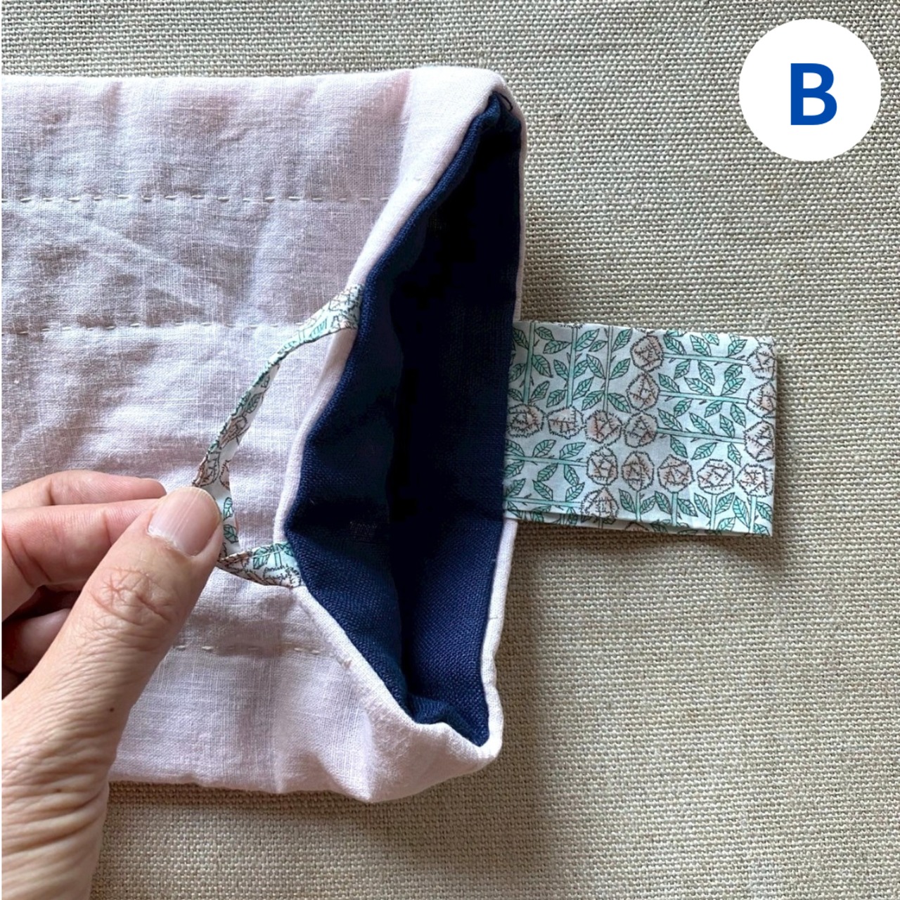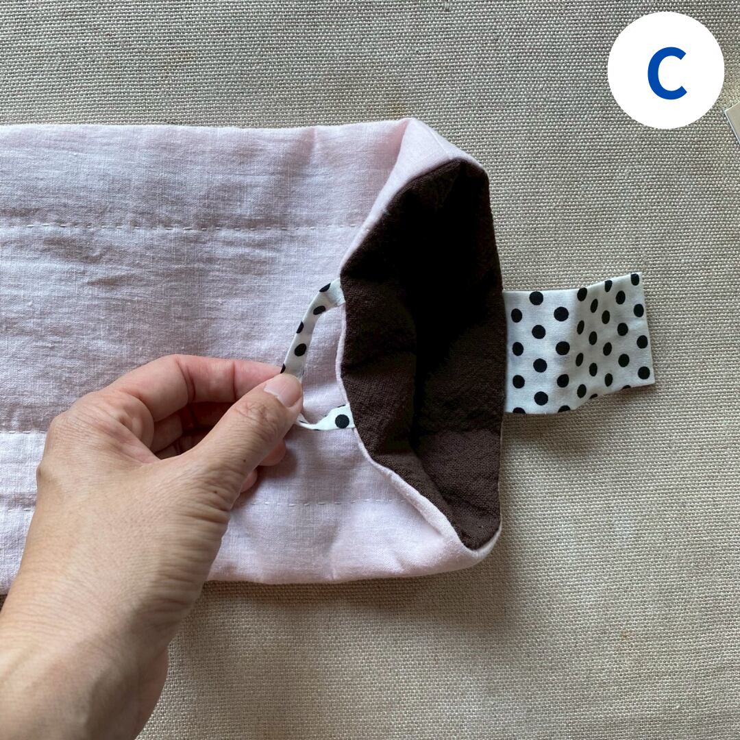 中にキルト芯が入っていて、手縫いもされています。ベビーピンクの生地とアクセントになる裏地や取っ手部分の生地の組み合わせをお楽しみください。